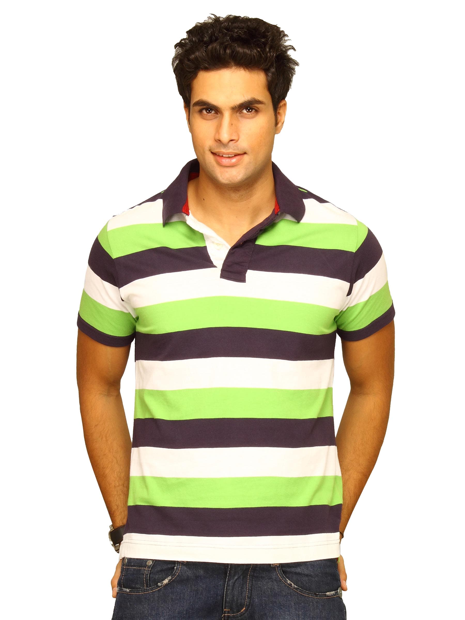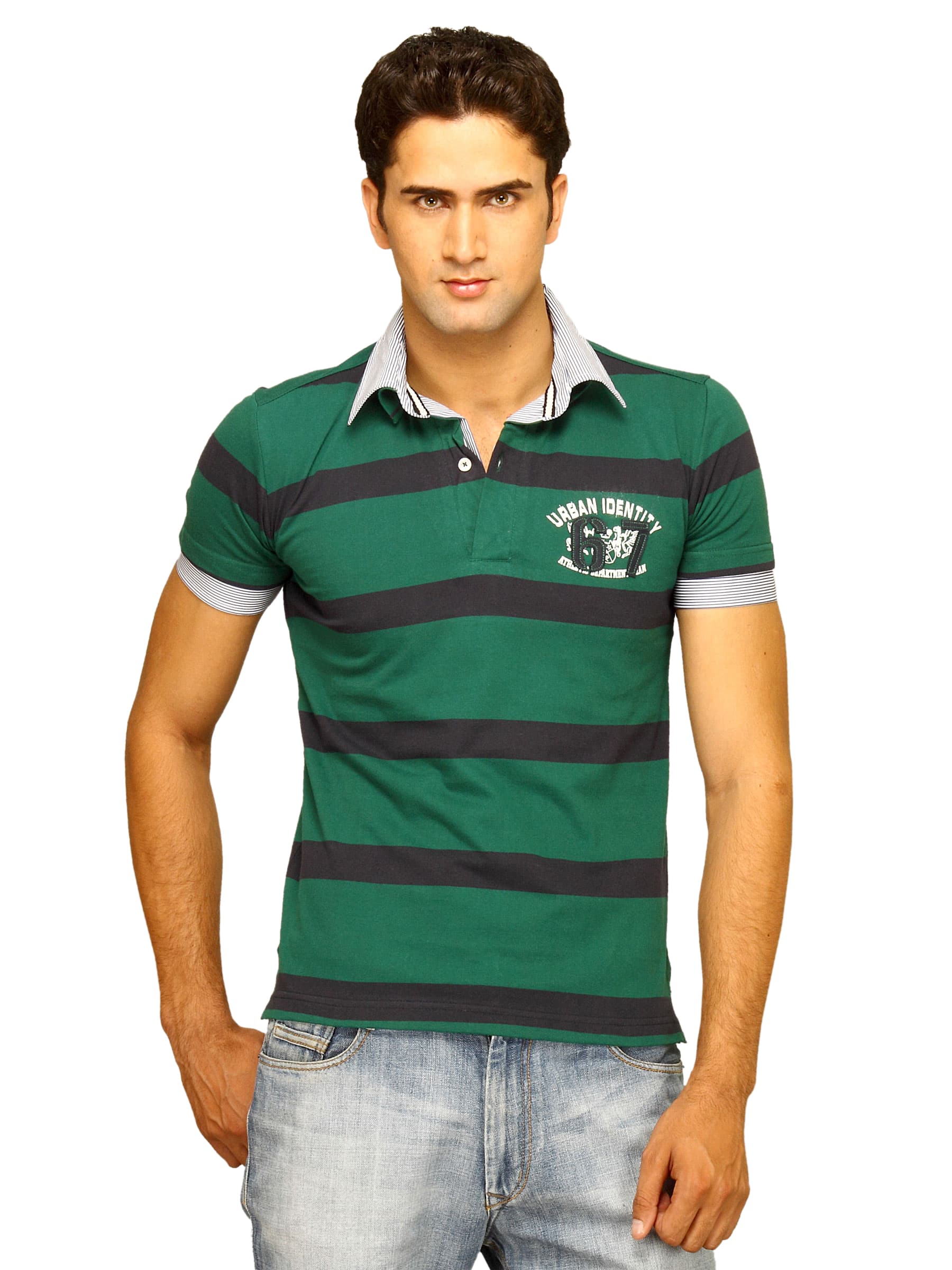 Basics Men White & Green Striped Polo T-shirt